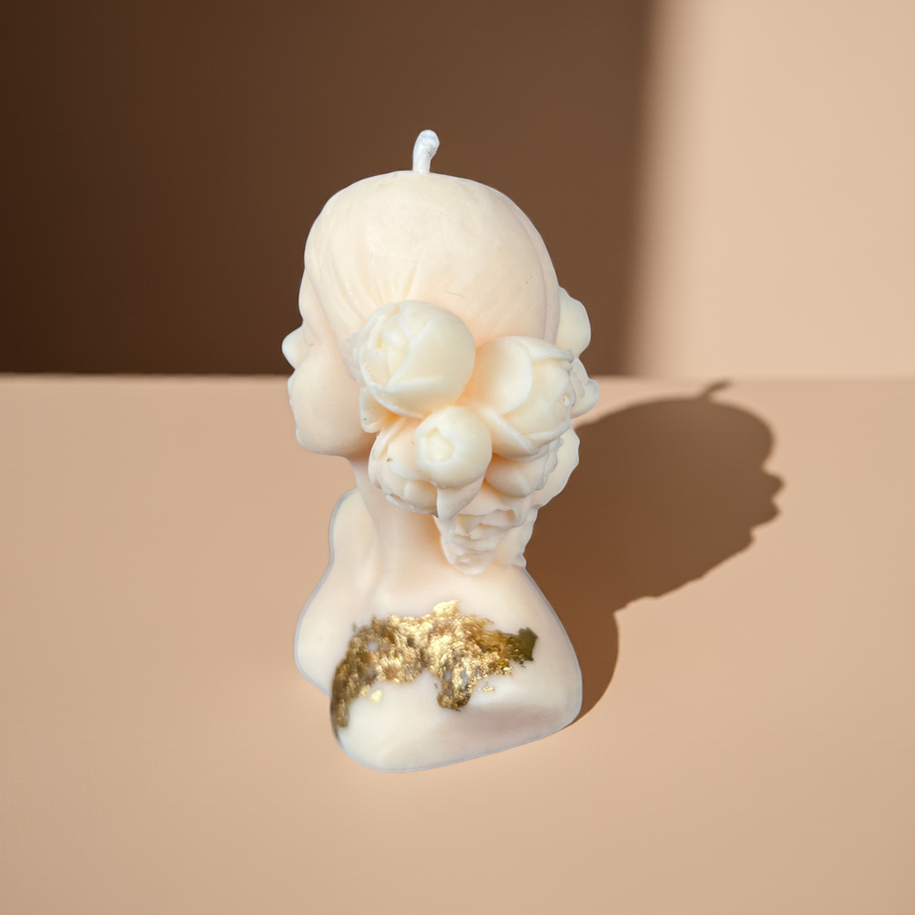 Laat je betoveren door de serene schoonheid van de KAARS CARMEN. Deze handgemaakte bustekaars van natuurlijke sojawas straalt rust, vrouwelijkheid en verfijning uit. De zachte gelaatsuitdrukking, gedetailleerde bloemen in het haar en een subtiele vleug bladgoud op de schouder maken deze kaars tot een waar kunstobject.