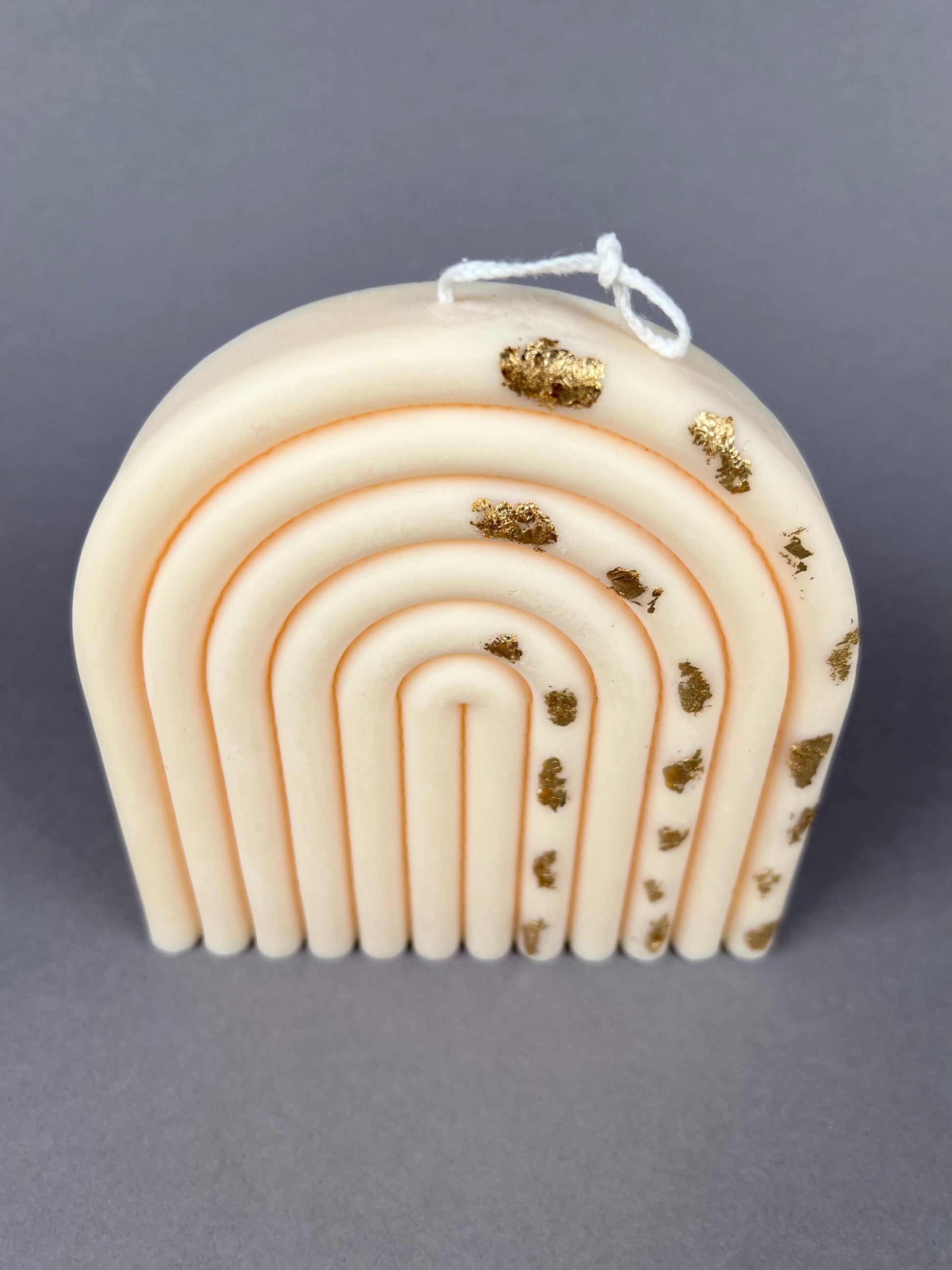 Breng sfeer en stijl in je interieur met de KAARS CÍRA – een uniek decoratiestuk dat kunst en functionaliteit samenbrengt. Deze handgemaakte designkaars, vervaardigd in Nederland van 100% natuurlijke sojawas, straalt luxe uit met haar subtiele boogvorm en verfijnde goudkleurige details.